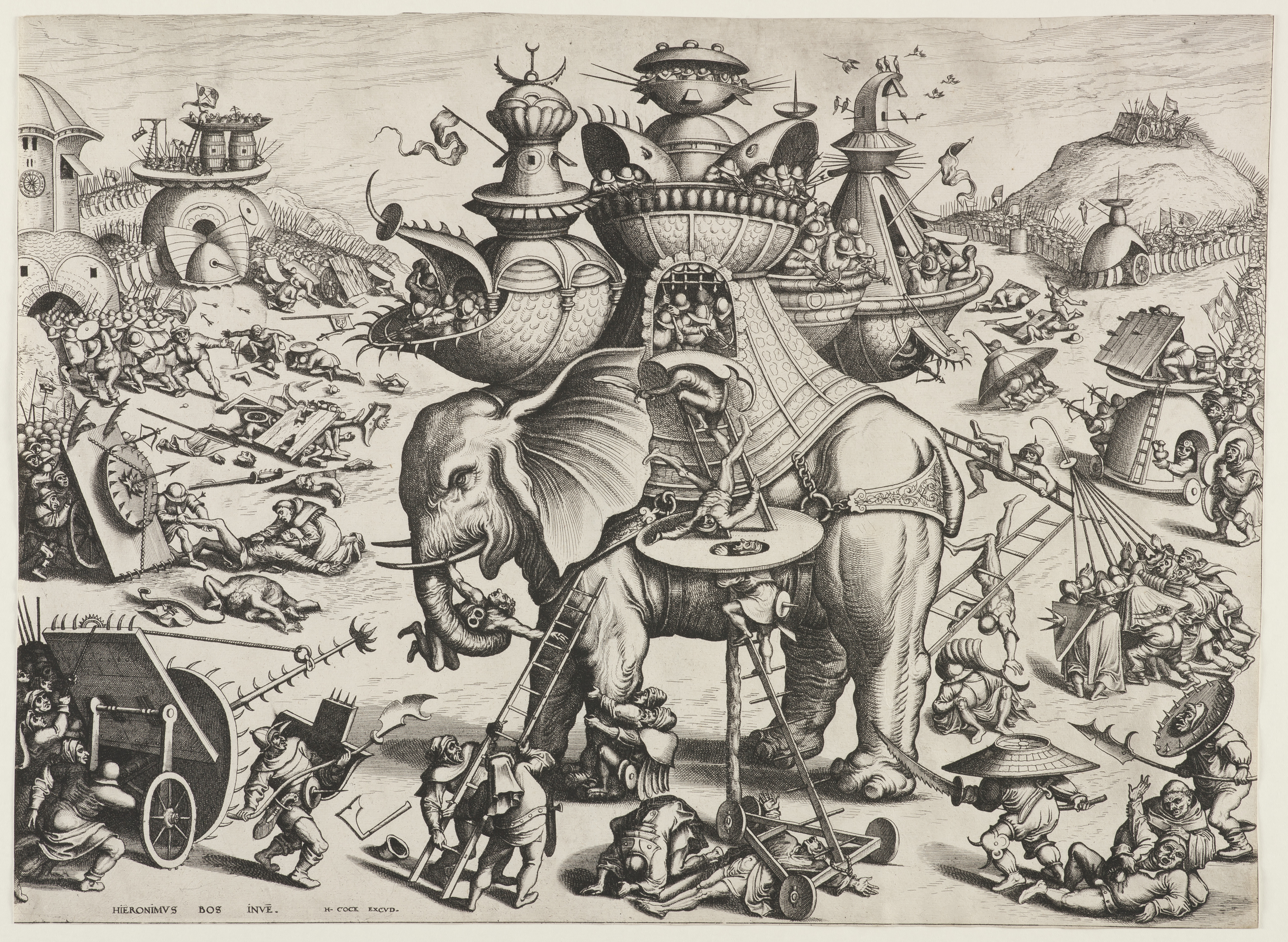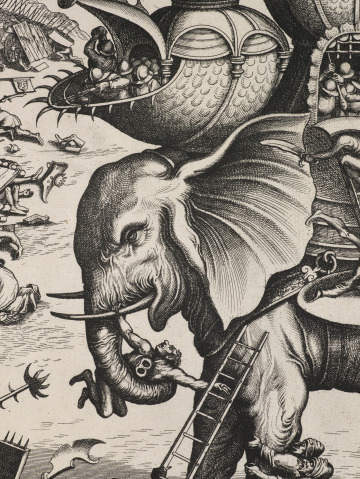 The elephant at the center of this oversize print bears the weight of an entire army. Dozens of helmeted soldiers armed with crossbows, swords, and projectiles are ensconced in a fantastical turreted structure fastened atop his back. Even the elephant has gone on the defensive and seized an opponent forcefully in his massive trunk. The print’s overarching message seems to warn mankind to beware of the dangers of extreme aggression.