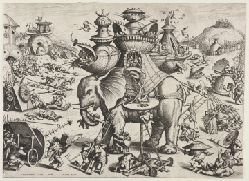 Although an inscription on the print identifies Hieronymus Bosch as its “inventor,” no such composition by the celebrated Netherlandish painter survives. Rather, this print’s inspiration came from a now-rare engraving by Bosch’s contemporary, Alart du Hameel. Hameel may well have adapted imagery from Bosch’s devilish inventions. Created decades later, this print was one of many that reinterpreted and updated Boschian themes for a new generation. In one such update, the many animals fighting alongside soldiers in the earlier version by Hameel are absent here, and all focus turns to the challenges of humanity.