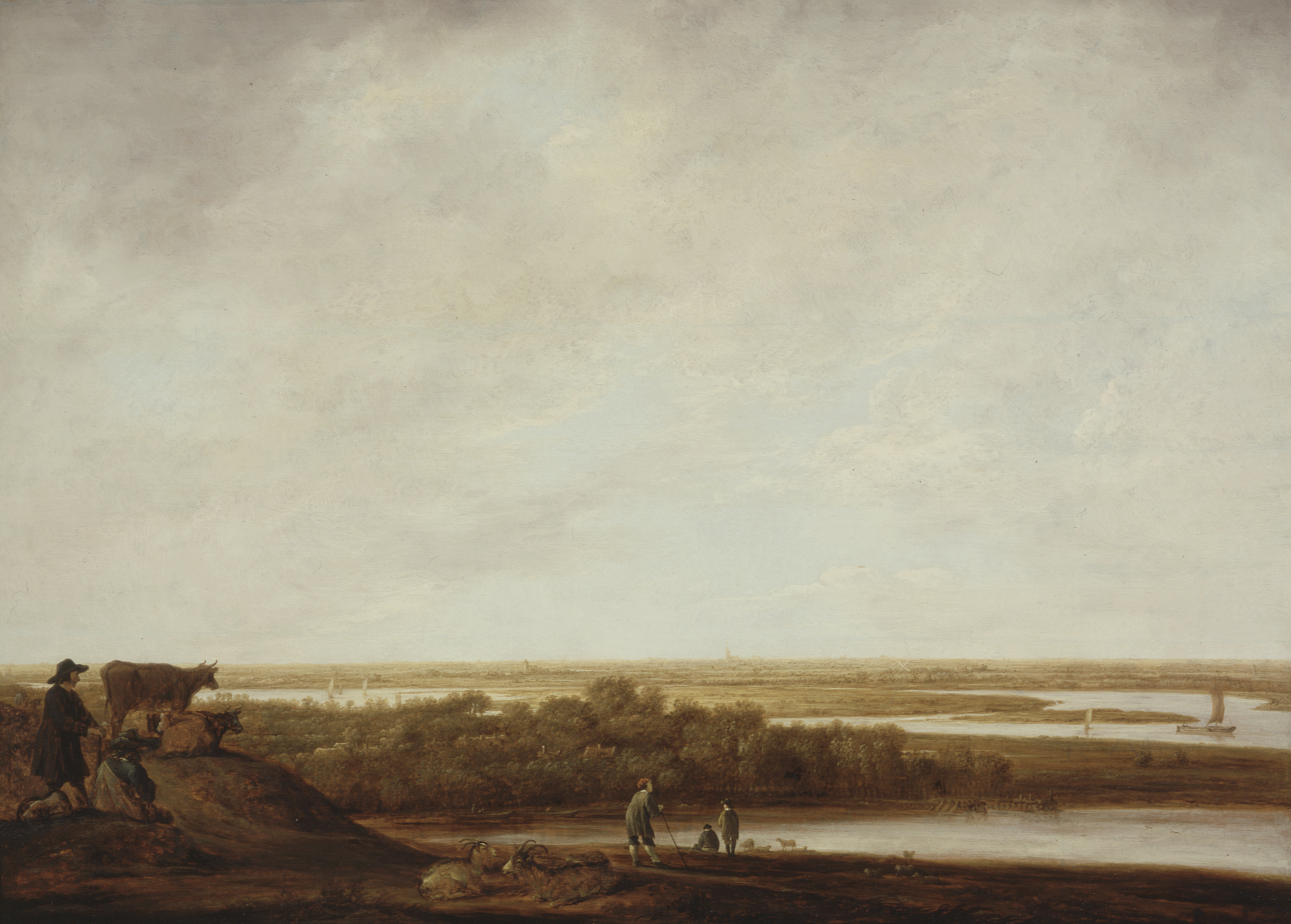 The flat horizon line and the subtle tones of the sky and reflective water surfaces are the major focus of this painting, rather than the humans or their bovine companions. Aelbert Cuyp uses delicate shifts in the color of the sky as well as a limited amber palette to describe the land and its inhabitants. While some of his contemporaries depicted a cloudy and misty sky, sunlight is often an important element in Cuyp’s pictures.