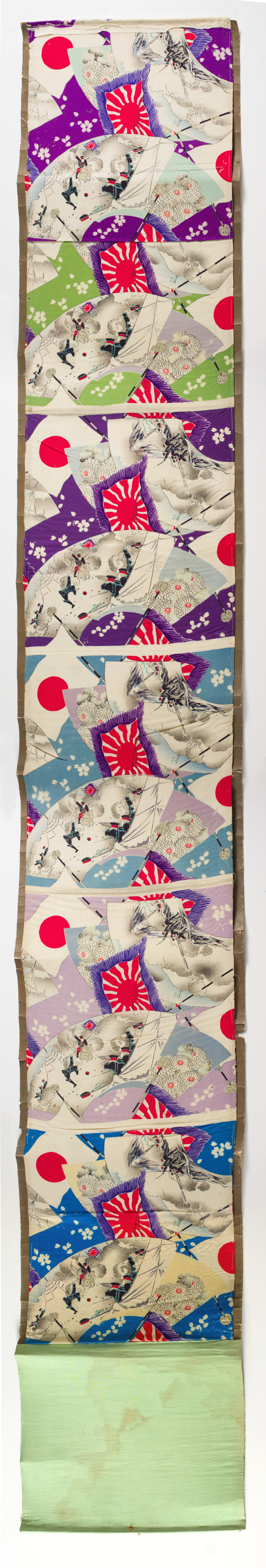 Children’s Kimono Fabric Sample with Design of Folding Fans, National Flags, and Rising Sun Flags from the Russo-Japanese War