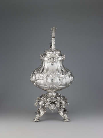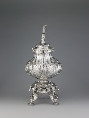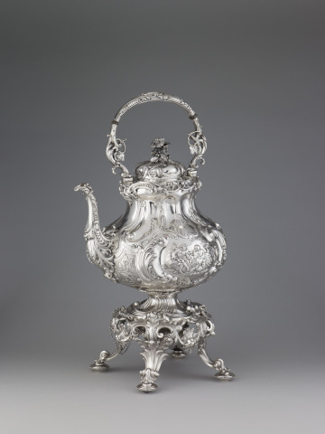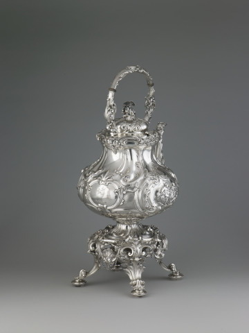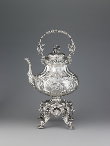 Although a tea kettle and stand is a rather typical object for a 19th-century home, this example is exceptional in its lavish decoration. Weighing more than 10 pounds, it is ornamented from top to bottom with designs of foliage, scrolls, and scalloped shells. It has elements that are individually cast, then applied to the surface, and areas with chased designs, which are drawn into the surface with a pointed tool and a mallet. Other sections have repoussé design made by hammering out the surface from the back side.
