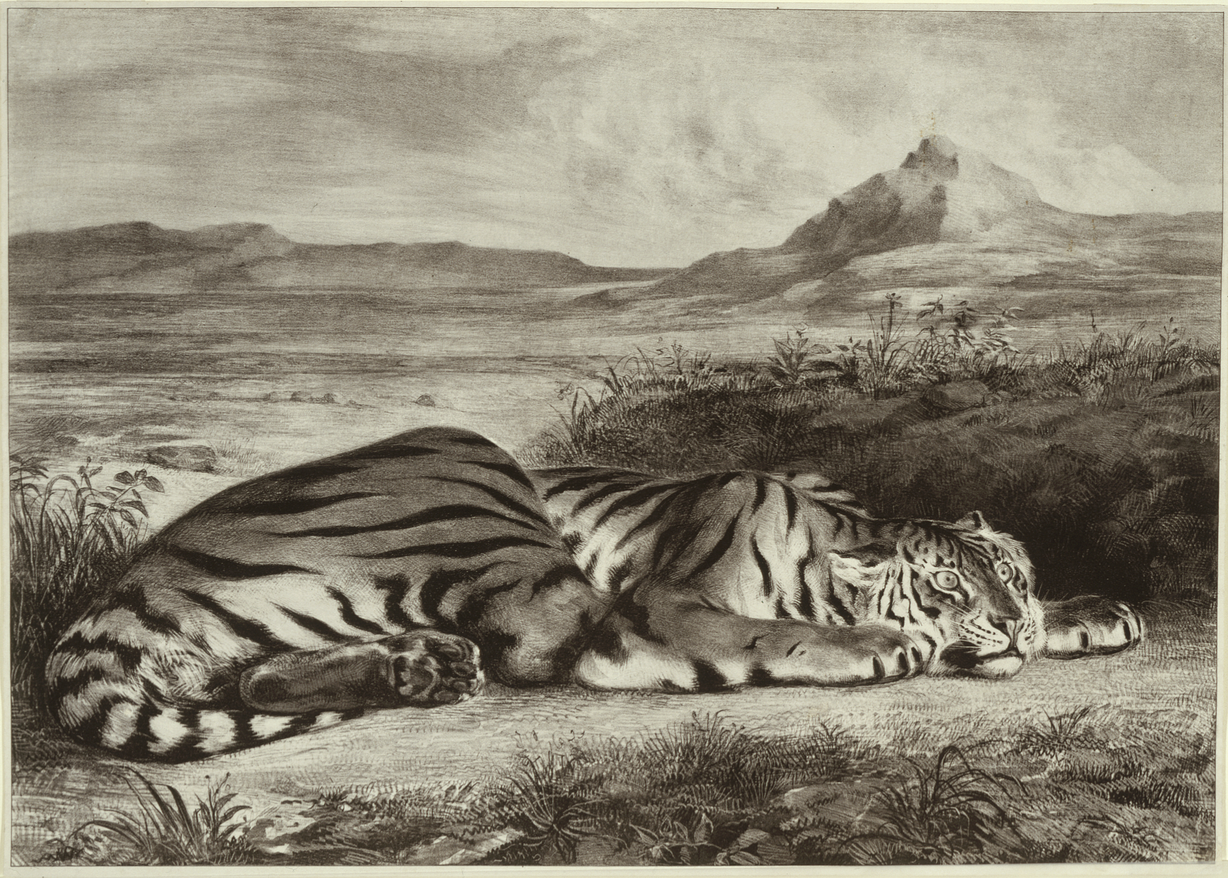 Eugene Delacroix’s tiger is lying on a bluff overlooking a vast plain. Its intense eyes are alert for prey and its muscular body is poised for action. "Royal Tiger" is among the finest lithographs from the 19th century. Delacroix embraced the medium of lithographic printing, invented in 1796, because he could achieve a painterly and naturalistic effect. He drew with a greasy crayon on a smooth stone surface and scraped away areas to be highlighted before the image was inked and transferred to paper.