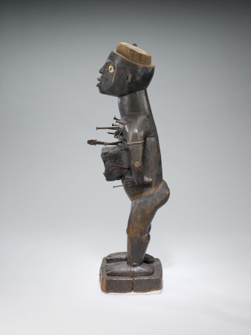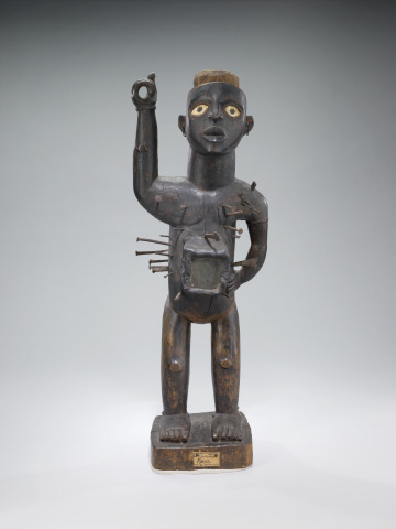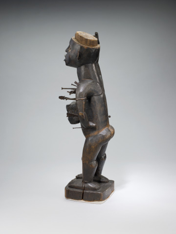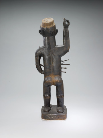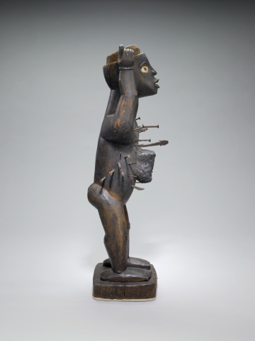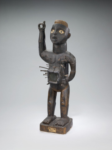 With alert eyes, head raised, and right arm thrust upward, this figure embodies the character of a hunter. Each iron blade or nail across the torso attests to specific moments when the nganga, a ritual specialist, called the figure into action or “to the hunt.” Directed by the nganga, the figure served purposes of healing, protection, or resolution on a client’s behalf.