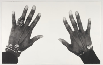 This is one of seven lithographic prints in Damon Davis’s "All Hands on Deck" portfolio: each image presents a different pair of hands held up high. The hands belong to individuals who were involved in the Ferguson, Missouri, protest movement that followed the fatal shooting of Michael Brown by a police officer in August 2014. “Hands up, don’t shoot” was a phrase that echoed throughout the protests, but in Davis’s images that gesture of surrender becomes one of resistance, fortitude, and community. According to Davis: “I tell stories that speak to the human experience. The hands you see are images I have captured of people who have shaped and upheld this movement. The people’s movement. It is our right—to be seen, to be heard…to be validated. It is our collective responsibility.”
