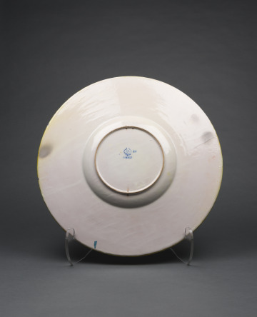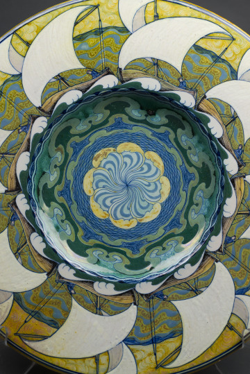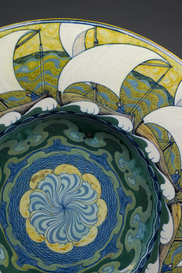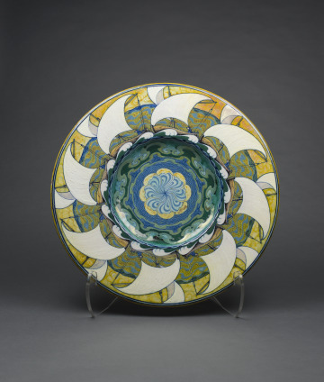 On this vibrant lustre-glazed dish, eight boats circle the rim with bright white, wind-filled sails, creating a dynamic rhythm. In the center is a whirlpool of undulating forms and linear patterning in shades of saturated blues and greens. Artist and designer Galileo Chini reimagined the historical ceramic traditions of his native Italy and the Mediterranean region with modern flair on this charger, or platter. Chini’s workshop in Florence, Arte della Ceramica, exhibited their ceramics to great acclaim at international expositions, winning a gold medal at the 1900 Paris World’s Fair and a silver medal in St. Louis in 1904.