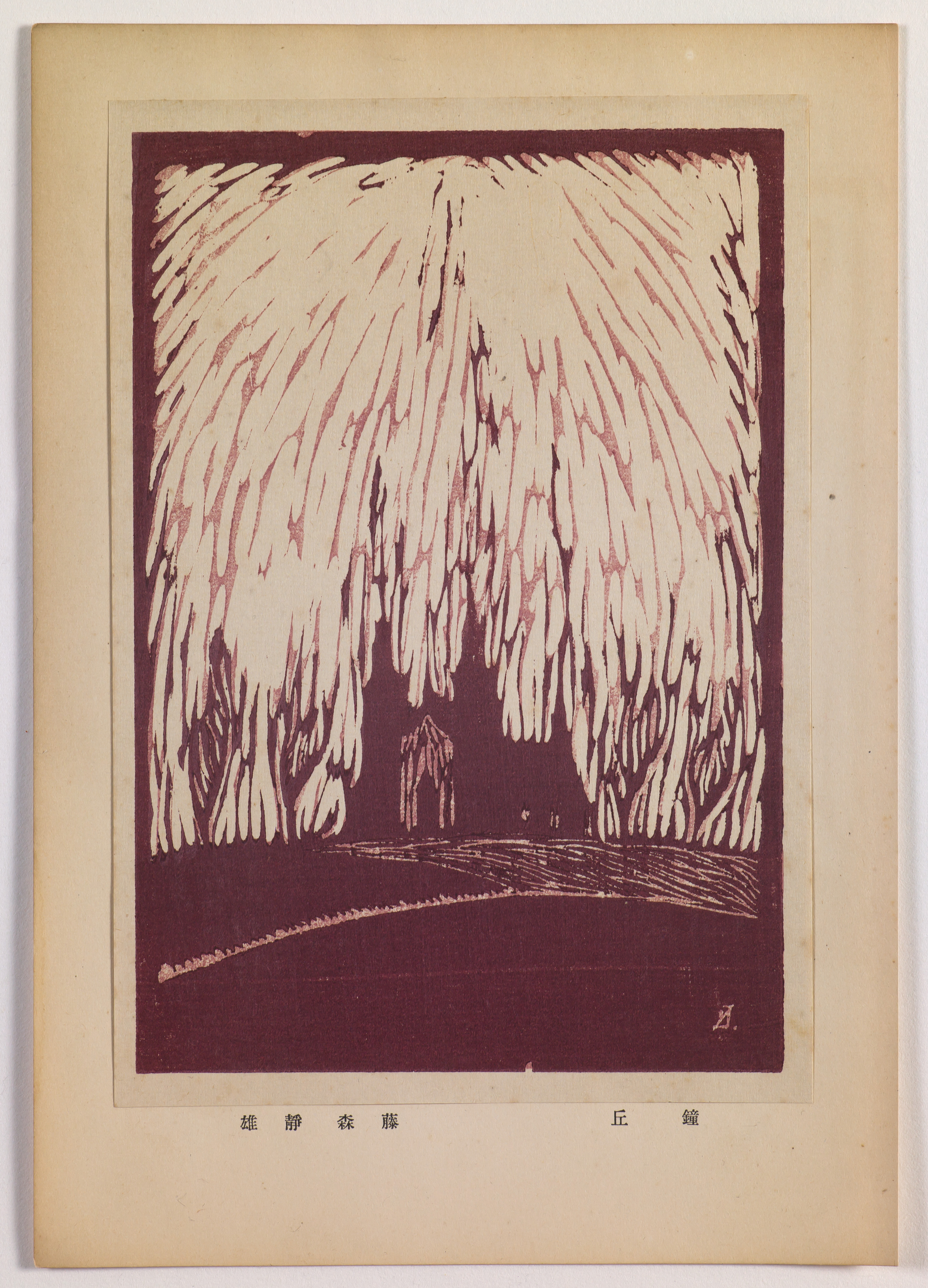 A cathedral on a wooded hill seems to dematerialize into a flaming sky. Treating the wood as his canvas and the chisel as his brush, Fujimori Shizuo carved the blocks roughly, leaving prominent marks that give the work an energetic, painterly quality and emphasize the physical character of his materials. He then printed the image himself, layering tones of dark pink. The dramatic composition, vigorous chisel marks, and unusual color scheme make this a particularly striking work.