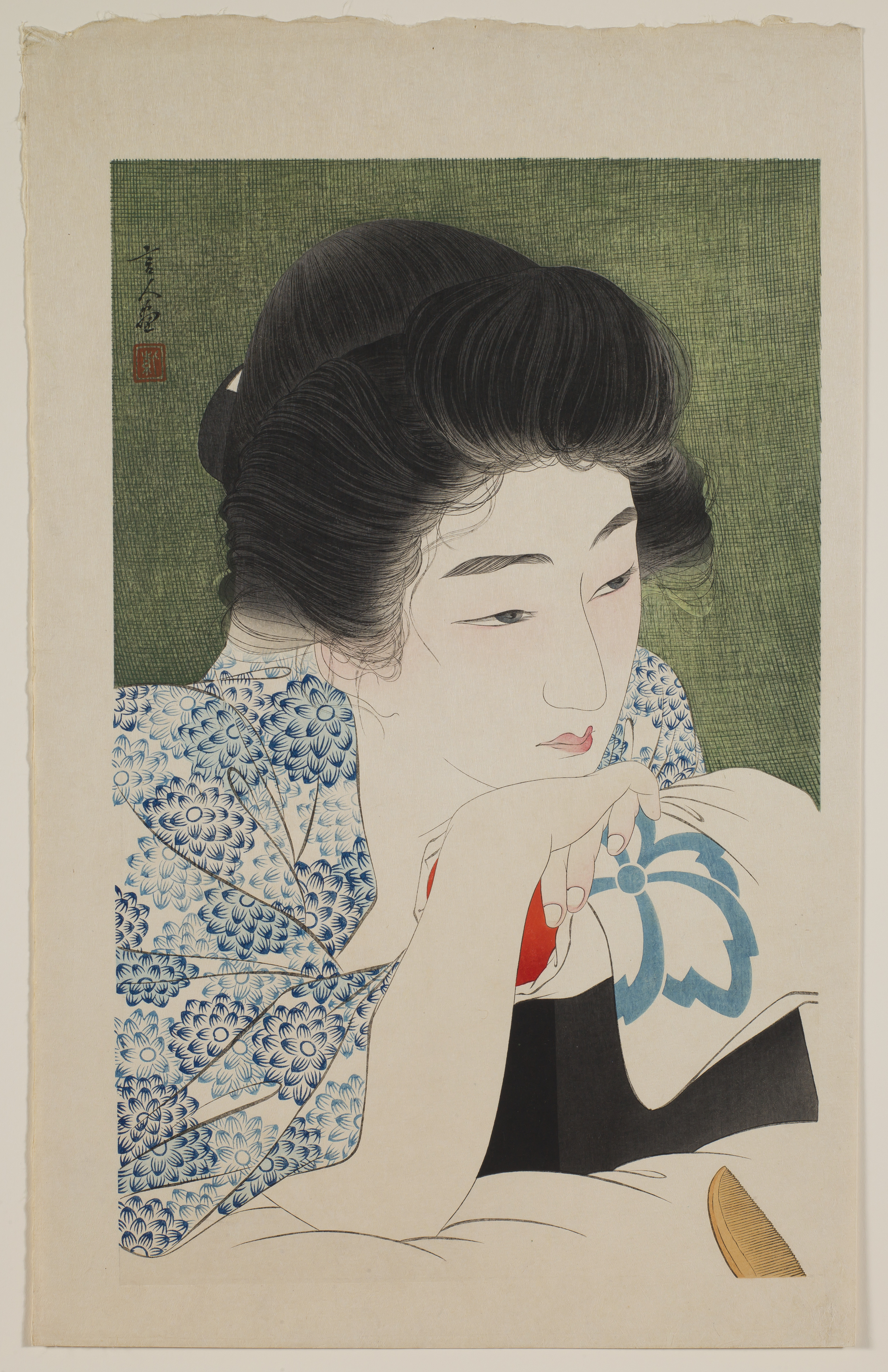 The title of this print, "asanegami," meaning “sleep-tangled hair,” alludes to a verse from the 8th-century anthology of poems "Manyōshū." The poem’s main character imagines his lovelorn wife refusing to comb her hair in his absence. Torii Kotondo modernized the theme with a young, fashionably dressed woman lying in bed with unkempt hair, brooding upon her lover’s departure. The slightly risqué subject, the striking green of the mosquito net in the background, and the exquisitely detailed execution make this one of Kotondo’s most memorable prints.