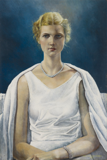 Does this portrait commemorate a marriage? St. Louis artist Siegfried Reinhardt painted this likeness of Jane Blackmer Wainwright in 1950, the year of her wedding. Her all-white attire—including the pearls on her neck and wrist—might hint at a bridal tradition. Yet, there is no ring visible on her finger, and the composition is curiously cropped at her hands.