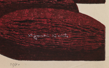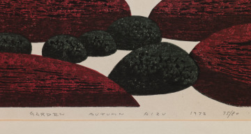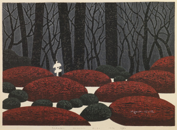 Saitō Kiyoshi’s work typically features imagery of “old Japan,” such as gardens, wooden houses, shopfronts, and Buddhist sculptures. Compositional elements are simplified into abstract fields of color and texture. His prints found favor with Western collectors in the period after 1945 for their blending of references to “traditional” Japanese culture and modern minimalism.