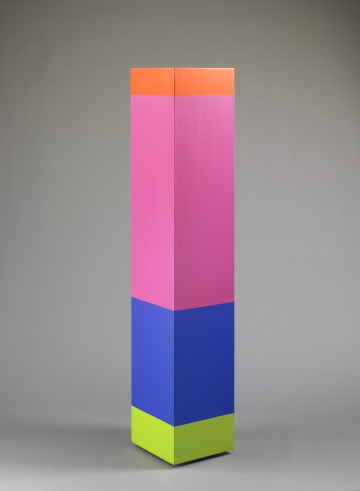 Anne Truitt painted horizontal bands of orange, fuchsia, blue, and lime green onto a rectangular column made of sanded plywood. Through her characteristic vertical forms, Truitt investigated the boundary between painting and sculpture. She described her freestanding painted objects as color “set free into three dimensions.” Inspired by the simple geometry of Barnett Newman’s paintings, Truitt applied elements of painting, such as composition and color, to her sculptural works. Truitt’s use of reductive, rectilinear forms associates her work with the minimalism art movement of the 1960s.