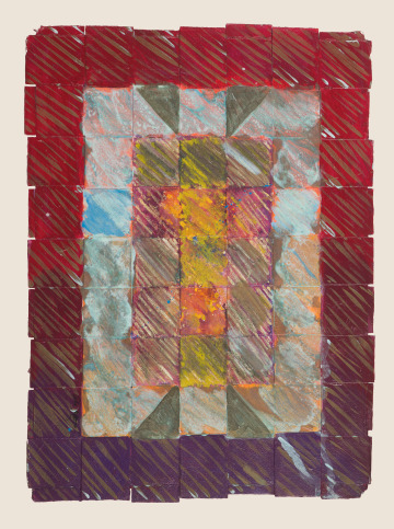 Constructed of interwoven paper strips, Rock Steady combines the bright colors and braided texture of southwestern textiles with the splatters and drips of expressive painting. Alonzo Davis created this work while he was dean of the San Antonio Art Institute during the early 1990s. He was drawn to motifs he encountered in Southwest Native American arts, which led to his “blanket series,” a collection of woven paintings. This work is one of over a hundred in that series, which later inspired large-scale installations.