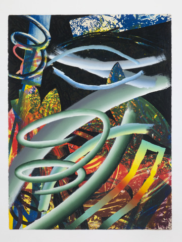 This work’s floating spirals, arcs, and leaf-like shapes are both printed and painted. Bill Hutson was inclined to revise his own compositions and paint on unconventional supports. After returning from Brandywine Workshop with a stack of impressions of the offset lithograph Ebco Na and responding to cues from the underlying image, he applied acrylic to create several variations, of which this is one. A staining method is coupled with hand-brushed marks—thick, linear accretions of finely blended color—evoking depth.