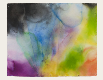 Atmospheric areas of color shift from a deep shade of black to bright orange, divided by sharp diagonal lines. When working with watercolor, which provides a brilliant luminosity, James Little will often score the surface with a sharp tool to trap color. As a result, there is a satisfying play between precise geometry of straight lines and the free-form washes achieved with watercolor. Little describes his method as “painting ideas” about color and matter, and his drawings, like this one, are a critical step in this process.