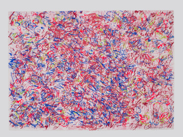 Sunset evokes flames engulfing redwood trees during a wildfire, a distinct memory from the artist’s time living in California from 1955 to 1976. Memory is a central theme of Evangeline Montgomery’s work. She uses travel diaries and photographs to transform her experiences and awe of nature into visual representations. Montgomery traveled extensively throughout her career starting in 1983, when she began work for the Arts America Program at the United States Information Agency. In her role there, she coordinated tours of American museum exhibitions at home and abroad.