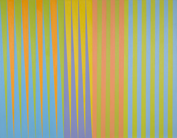 Brightly colored triangles transform into vertical stripes moving from left to right. James Little’s variation of color, shape, and interval width within a repeating pattern create a dynamic composition. Little uses historic painting materials to create abstract works like "Double Exposure." According to the artist, “I’m not interested in illusionism, I’m interested in flatness and materials that keep illusions at bay.” Little painted with a mixture of heated beeswax and raw pigments, developing a version of the encaustic painting technique first used by ancient Egyptians and Greeks.