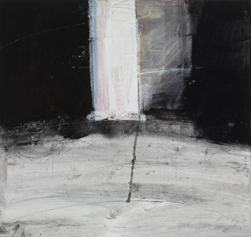 This seemingly simple work actually contains many layers of paint and fabric. Scratches through the black on the left reveal a ground of bright orange, also evident under white areas in the lower half. The white rectangle in the center is built up from layers of cut canvas, and its side shimmers with iridescent pinks and gold. Frank Wimberley’s approach to assembling these elements was improvisational and inspired by jazz. In turn, it was appreciated by musicians such as Miles Davis, who collected his work.