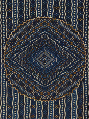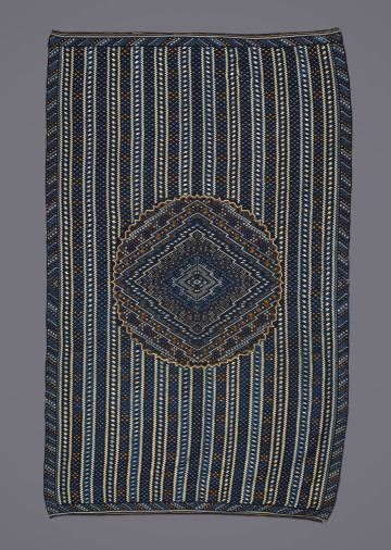 The intricate pattern of this wearing blanket achieves a striking sense of tension between the central diamond figure and the repeating, small-scale background. Featuring one of the most complex designs of its era, this textile was likely created by specialist weavers at a small workshop north of Mexico City.
