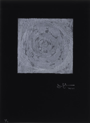 Printed from seven lithographic stones, White Target exemplifies Jasper Johns’s love of process, repetition, and the history of line and gesture. One of his earliest experiments with lithography, White Target is printed on a thin sheet of black Japan paper that is adhered to a sheet of French Canson paper, a process known as chine collé.