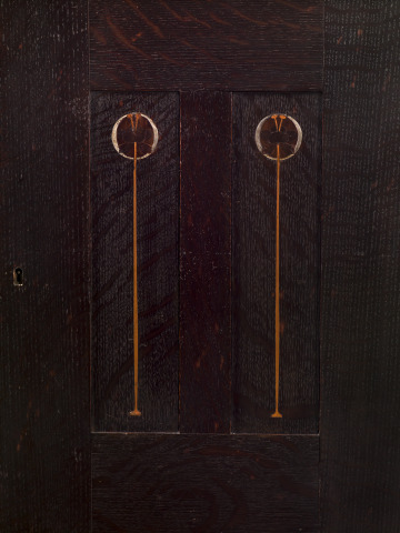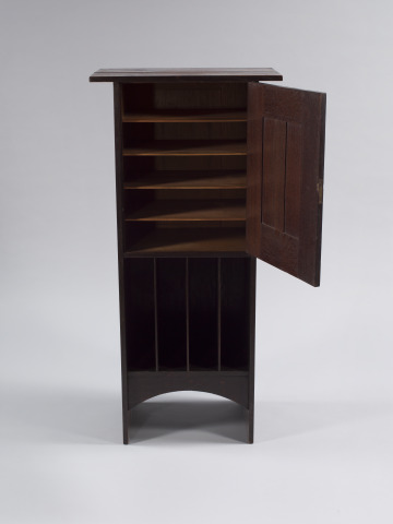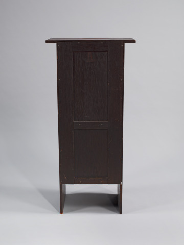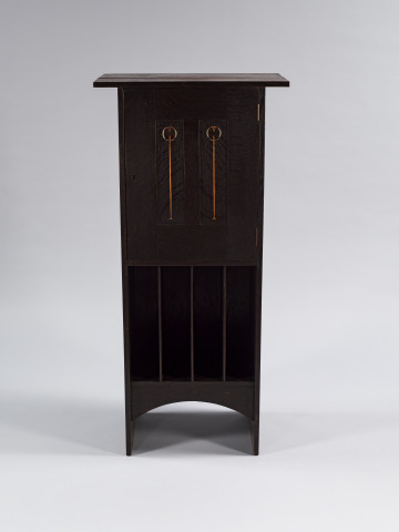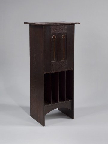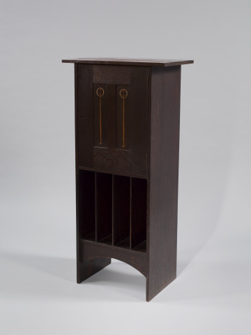 From 1900 until World War I (1914–1918), furniture maker Gustav Stickley was a leading contributor to the American Arts and Crafts movement. During the 1880s and ’90s, Stickley was a successful manufacturer of middle-class Victorian furniture. He first explored consciously artistic furniture in 1900, gradually developing radically spare forms that evoked the sentiments of English designer William Morris, for whom simplicity was the essential requirement of modern furnishings. Stickley renamed his business the United Crafts and, in October 1901, began to publish The Craftsman magazine. In 1903 and 1904, the Stickley style was further refined in favor of attenuated forms embellished with inlaid ornament, as seen in this music stand.