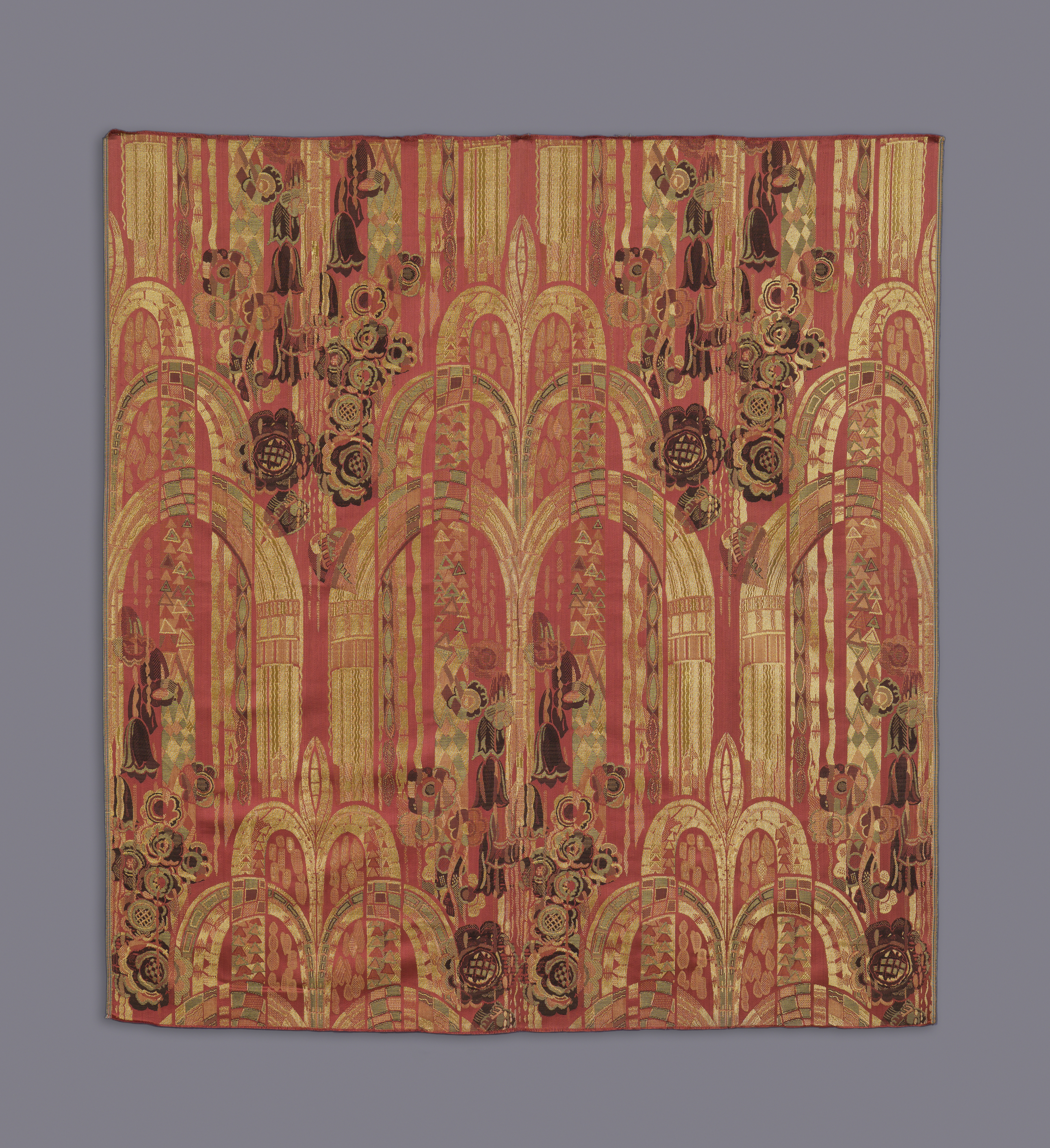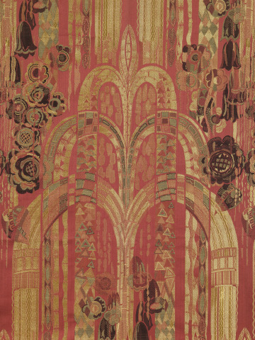 Stylized streams of water—chains of squares and triangles and waving rivulets—form shimmering arches across this textile’s burgundy ground. Abstracted blossoms bubble up from the base of the jets in a lively floral froth. In the 1910s and ’20s, French designer Édouard Bénédictus translated natural forms into complex, geometric flat patterns for textiles, wallpaper, carpets, and inlaid leather. Presented at the 1925 Paris World’s Fair (L’Exposition Internationale des Arts Décoratifs et Industriels Modernes), Fountains covered the walls of a grand reception room in an imagined French embassy.