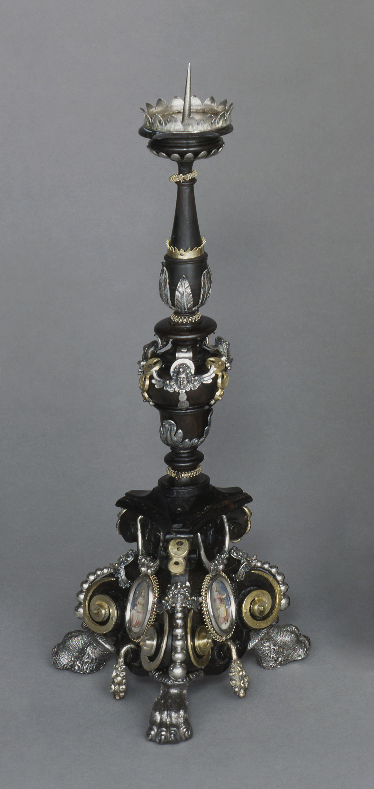 This altar and two candlesticks consist of an ebony facade over a pear-wood core. They are all adorned with decorations in silver and silver gilt (silver with a thin coating of gold). A Crucifixion scene dominates the altar with cast silver figures of Christ, Mary, Mary Magdalene, and a fourth figure. Standing on the base are Saint Cecilia with her portable organ (on the left) and Saint Catherine with a broken wheel, her usual attribute. Seven chambers hold relics; some contain an identifying notation on parchment. The candlesticks are positioned so that Faith faces forward on the left and Charity on the right. Each candlestick is adorned with images of the three theological virtues—Faith, Hope, and Charity, all painted on parchment.