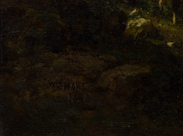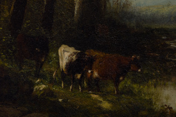 Three cows pause beside a stream in an idyllic setting. The artist, William Hart, was well known for his prolific paintings of landscapes and cattle that convey people’s harmonious relationship with nature.