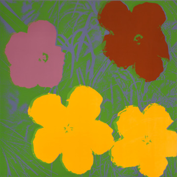 Warhol borrowed his image of flowers from the popular press, specifically the June 1964 issue of Modern Photography magazine. He first cropped the photograph and rotated the image. His assistants then copied and recopied it many times over, which degraded the image and removed its photographic detail, resulting in the high-contrast image seen in these prints.