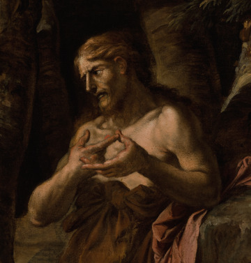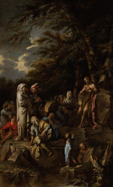 Painted on a vertical canvas like an altarpiece, this scene depicts St. John the Baptist preaching to a crowd about how to prepare for Jesus’s impending arrival. The shimmering water alludes to John’s role as the baptizer of Jesus, and the children playing at the river’s edge illustrate the idea of baptism as a form of rebirth. Characteristic of his style, Salvator Rosa surrounded the composition with looming trees set against a moody sky and “blasted” trees in the foreground, while figures pose on jagged rocks like actors on a stage.