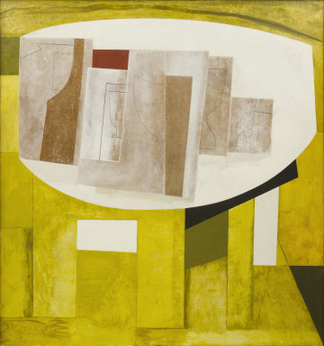 Delicately drafted outlines suggest a tabletop arrayed with goblets and jugs while the white, ovoid shape in the center alludes to the lunar subject of this painting’s title. Ben Nicholson’s work reflects his interest in Cubist still life as well as his continued engagement with geometric abstraction. Nicholson painted directly on a Masonite board, allowing the grainy support to show through while adding textural variation with passages of oil paint and thin washes of gesso.