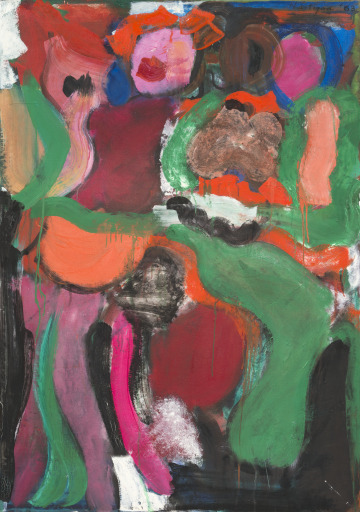 Gestural swaths of green, magenta, orange, and blue dance across the surface of this canvas. These colors form a cluster of human figures, perhaps hurrying along a street in Baltimore. Grace Hartigan’s painting style is characterized by seemingly contradictory elements, as she stated in 1956: “I want an art that is not ‘abstract’ and not ‘realistic.’ ” Her works feature complex surface designs that often reference the city or the natural world. This example was painted soon after Hartigan’s 1960 move to Baltimore from New York, where she had been a central figure in the Abstract Expressionist community of artists.
