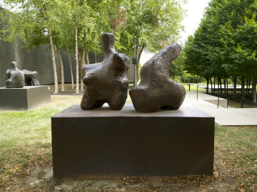 This massive sculpture represents the first time that Henry Moore separated the two elements of the human torso. The head and upper body are clearly visible in one piece and an upwardly projecting leg in the other. For Moore, this division heightened the relationship between the configuration of the human body and natural forms: he compared his sculpture to “a landscape of a rock.”