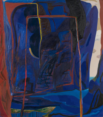 In this layered composition, sinuous forms and spatial distortions coincide with expressive brushstrokes and vivid color, creating a space both otherworldly and familiar. Seemingly abstract at first glance, Fight or Flight slowly divulges its relationship to landscape. A red sun peeks out in the upper left corner, and a sliver of turquoise-blue sea appears in the distance. Shara Hughes refers to her paintings as psychological or invented landscapes. Composed spontaneously, rather than from preliminary sketches, her works radiate a complexity that derives from memory, observation, and illusionism.