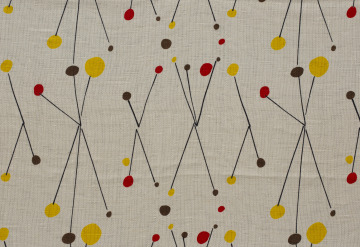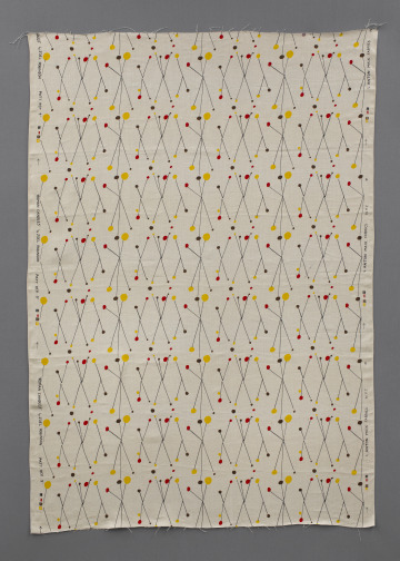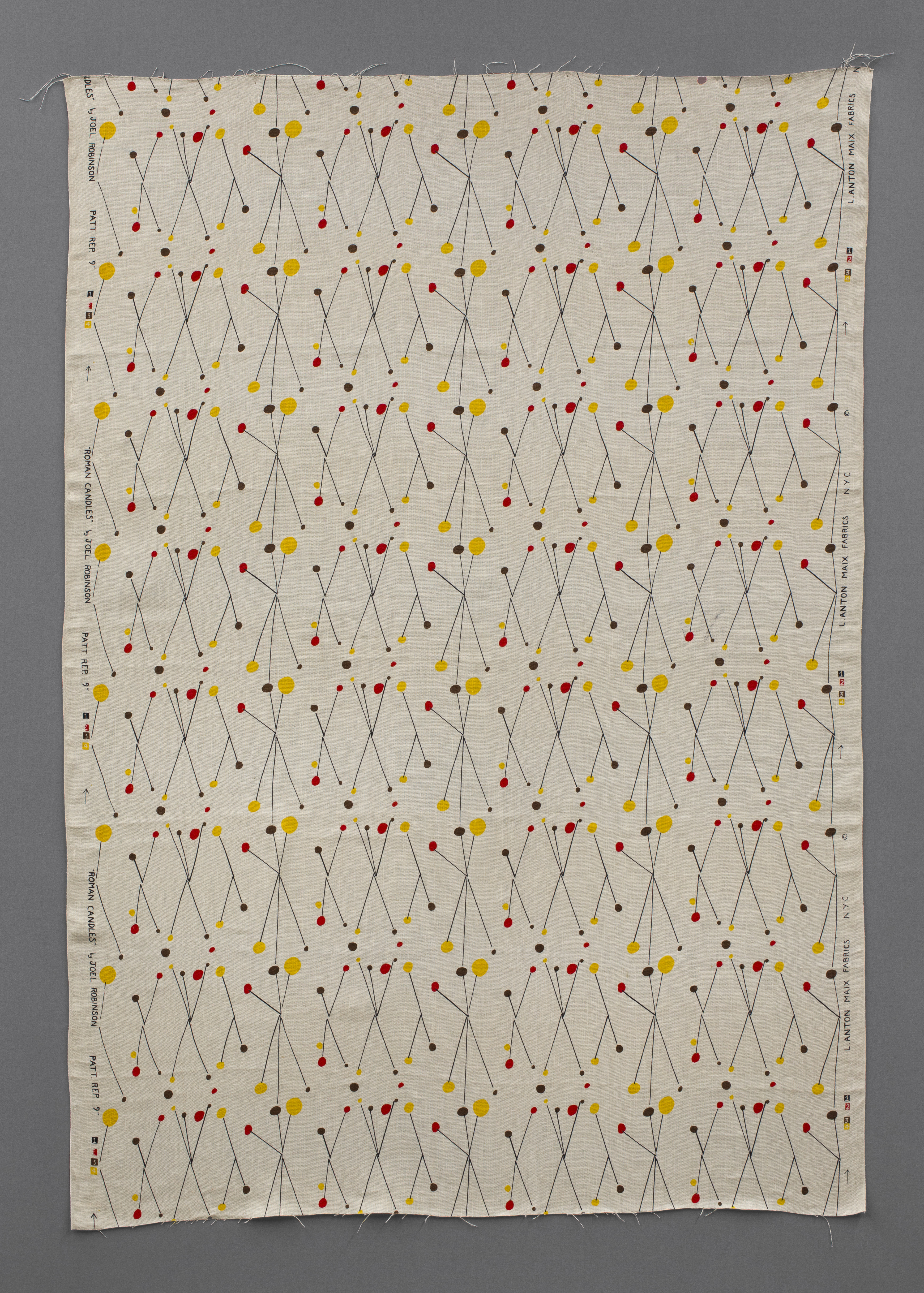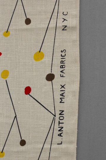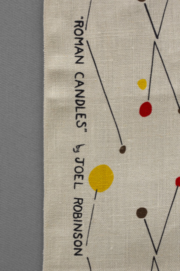 Fireworks—bursts of orange, yellow, and brown—shower this screen-printed linen designed by A. Joel Robinson for L. Anton Maix Fabrics. Fittingly titled "Roman Candles," this textile captures the painterly sensibility and architectural training of its multifaceted designer. Robinson is one of the first African American designers to have gained national attention in the mid-century. A 1951 "Ebony Magazine" article described the “youthful New Yorker” as “the most promising newcomer in the creative textile design field.” That same year, "Roman Candles" was featured in the Museum of Modern Art and Chicago Merchandise Mart’s Good Design shows.