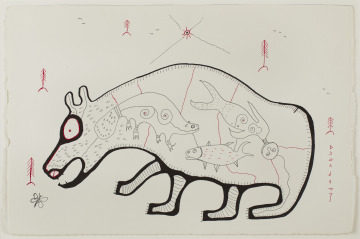 This profile of a bear reveals multitudes. Inside, energetic red waves connect a beaver, fish, and a transformational figure to each other and to the bold, fluid outline.