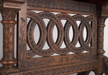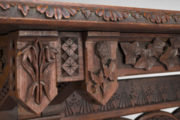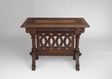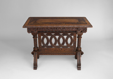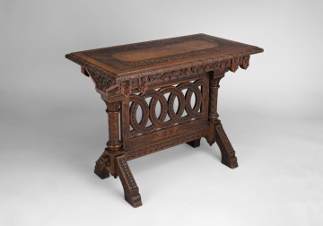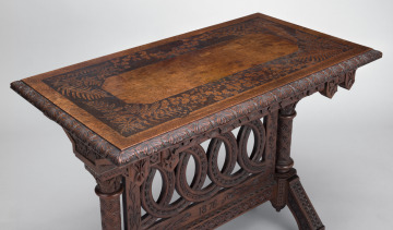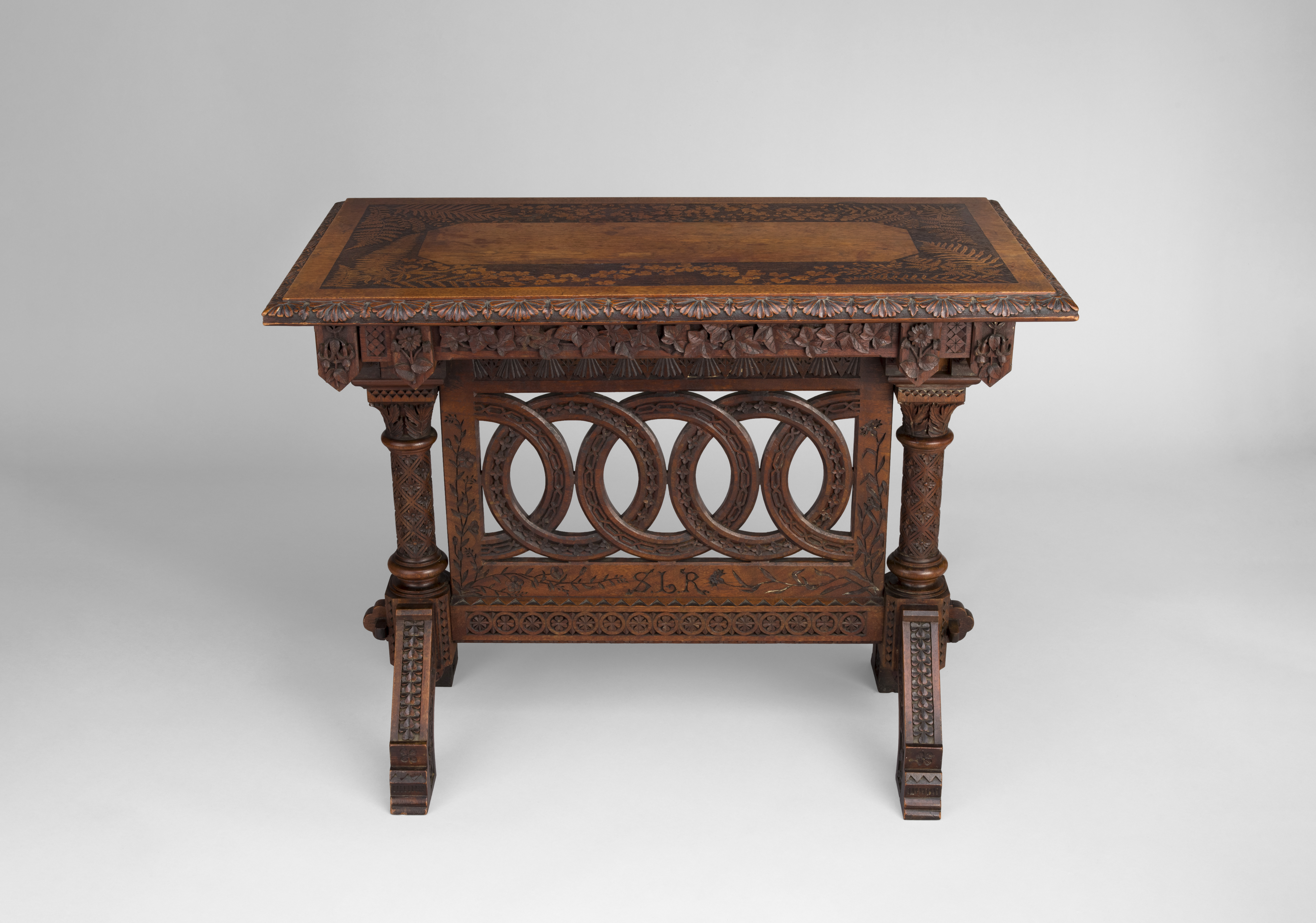 In Midwestern cities like Cincinnati, Ohio, where this table was made, and St. Louis, Missouri, many women practiced woodcarving, china painting, and other decorative arts. A table carved by Julia Hall Rice, possibly this example, was included in the influential exhibition of decorative arts by Cincinnati women at the Centennial Exposition in Philadelphia in 1876.