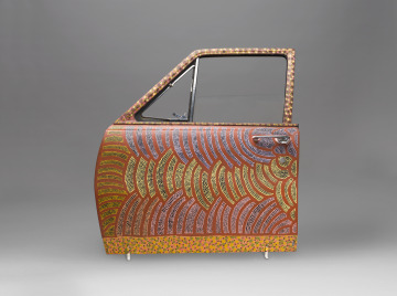 This car door painting references Aboriginal body paint designs that convey a Dreamtime story about Mountain Devil Lizard. The story and designs are associated with the artist’s family, and they appear frequently in works by her and her sisters.