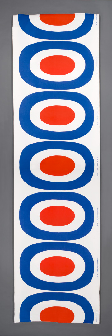 The blue rings surrounding orange-colored ovals in this textile may call to mind target practice, but designer Maija Isola had something more benign in mind. Melooni, or “melon” in Finnish, is a further simplification of Isola’s already stylized Vesimelooni, a pink and green print of watermelons from 1963. Part of her Arkkitehti series for the Finnish fabric company Marimekko, Melooni’s striking bullseyes have a visual kinship to American abstract painting of the same period.