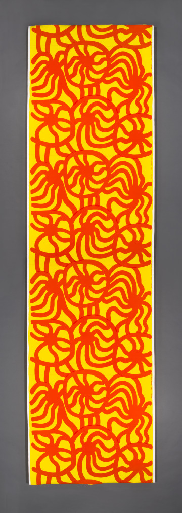 The rippling surface of the Mediterranean Sea inspired the large, loose waves of this textile. Joonas was among designer Maija Isola’s first “macroprints” for the Finnish textile manufacturer Marimekko. These large-scale patterns have huge repeats, the distances between the start and finish of a motif. Isola often looked to nature for inspiration and frequently worked on the floor, using sweeping gestures to create her abstract designs. Originally produced in black-and-white in 1961, Joonas took on ever-wilder proportions in this blistering 1964 combination of saturated yellow and orange.