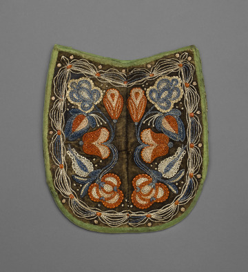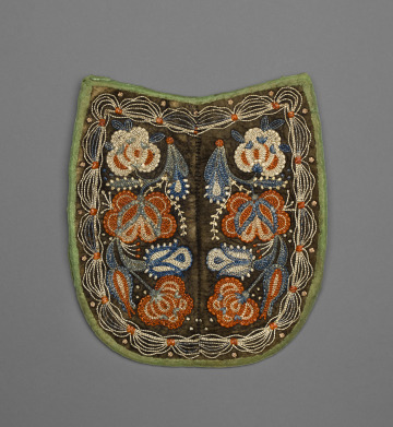 Hair embroidery on hide is an ancient Indigenous practice in the Northeast. In the 18th century, however, colonial Ursuline nuns adapted this technique to convent wares that included botanical imagery. Wendat artists later incorporated novel floral imagery in their own work for sale such as this pouch.