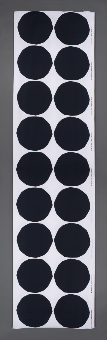 The clipped curves of these monumental black dots lend an organic edge to this highly graphic textile. Designer Maija Isola created this simple but striking design with paper cut-outs, looking to the irregular shape of stones—"kivet" in Finnish—for inspiration. Isola’s outsized, abstract patterns helped catapult Finnish textile and fashion company Marimekko to international fame in the 1960s.