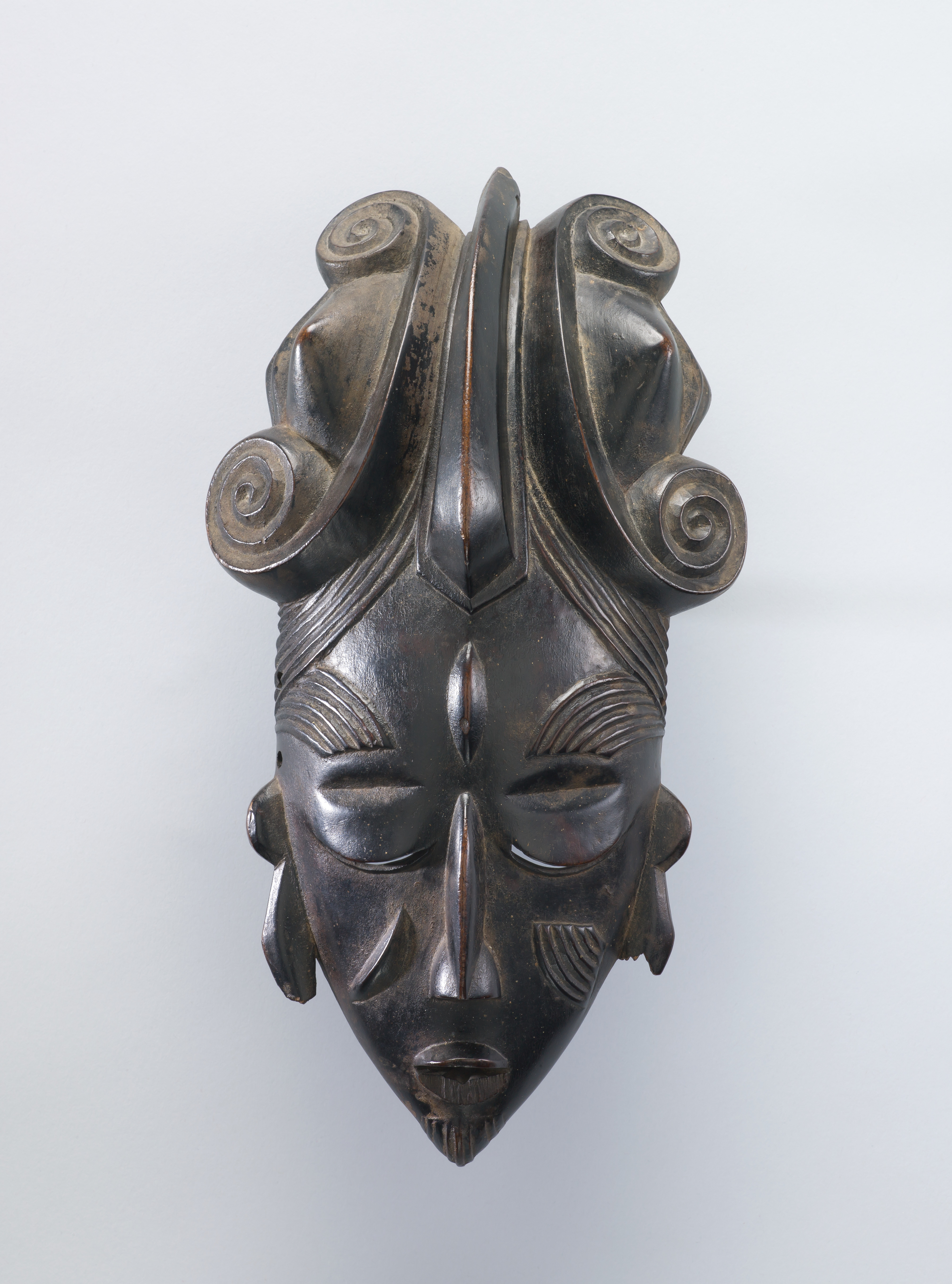 This mask celebrates female beauty through its exquisite hairstyle and refined traits. Its lustrous surface results from the application of oils and pigments, such as indigo and henna. In addition to earrings or other jewelry, these materials would refresh the mask’s appearance before each performance. An entertaining spectacle among Muslim communities, "Do" masquerades occur at weddings and celebrations connected with the Islamic calendar such as during the month of Shawwal, a time of rejoicing after the month-long fasting during Ramadan. Dancing in an open space in front of a mosque, "Do" masqueraders complement the mask with a full body costume of colorful printed cloth.
