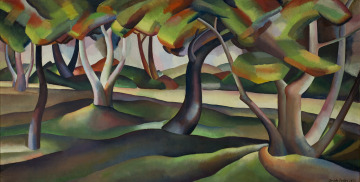 [1] A 1931 article describes the commissioning of this painting for the Rauh home ["Jones Commissioned to Decorate KMOX in Modern Manner." Art World 1, no. 3 (December 1931): 3]. Jean Rauh Block and Elsie Rauh Scherck, who were sisters, likely acquired the painting from their parents, Elsie and Aaron Rauh, by gift or inheritance. According to an email dated February 2, 2005, from Ernest Stix, Mrs. Aaron Rauh had "an uncommonly long" landscape by Joe Jones, which may have passed to Jean Block or Elsie Scherck [SLAM document files]. In a later email dated February 20, 2005, Stix confirmed that "Wooded Landscape" is the painting he recalled [SLAM document files].