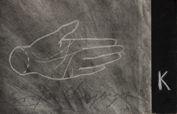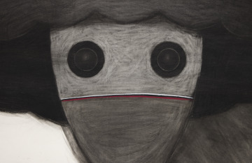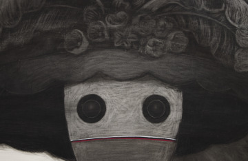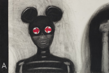 The looming figure of “La calavera catrina” (the elegant skeleton) or “La calaca” (the skeleton) is an image associated with Mexican commemorations of the Day of the Dead. The festival celebrates the departed and satirizes the living. The large skull has been reduced to two staring eyes under a characteristic hat of feathers and flowers. A smaller skeletal figure wearing Mickey Mouse ears accompanies her. The sense of dramatic contrast is heightened by the intensity of charcoal and pastel layered and strewn across the broad expanse of paper.