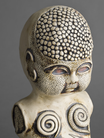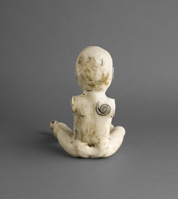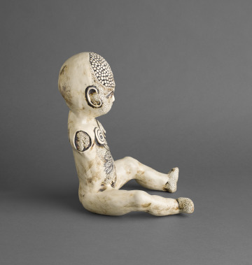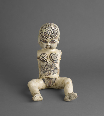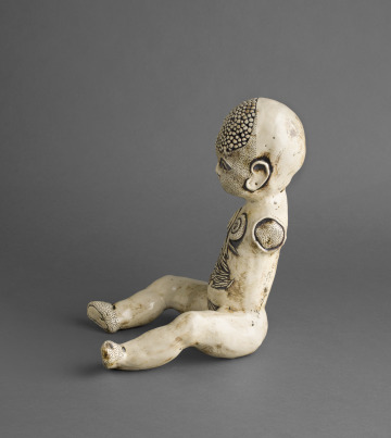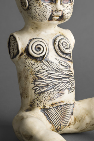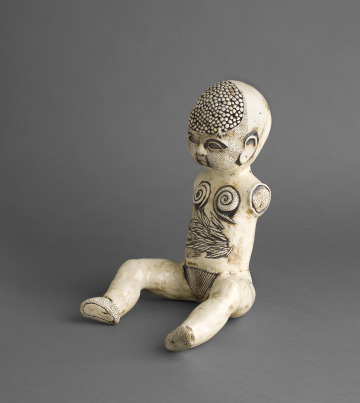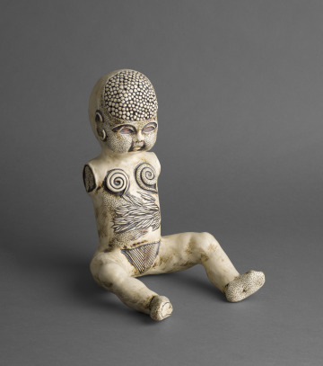 This curious figure suggests a vintage baby doll with missing arms and what appear to be calcified growths on its chest and head. Michele Oka Doner has long been inspired by organic material, especially ocean life and seashells. She shares, “The clay forms recalled the fragmentary nature of the corals I picked up on the beach.” Oka Doner sculpted about a dozen different ceramic dolls starting in 1966, her final year at the University of Michigan. In 1967, photographs of Vietnamese children burned by napalm shocked the American public, and the dolls quickly became symbols for anti-war protests. The artist embraced this interpretation and had it in mind when creating additional versions.