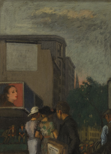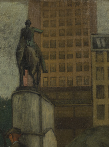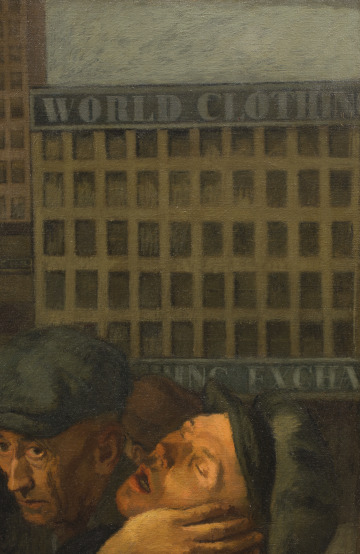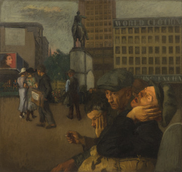 The artist, Raphael Soyer, came to New York City in 1912 as one of many Jewish immigrants who fled persecution and violence in Russia. He painted during the Great Depression (1929–1939) and often focused on the hardships of the city’s unemployed and unhoused communities. A statue of George Washington stands in the background of the painting. It looks the other way, suggesting that democracy has also turned its back on the struggles of these men.