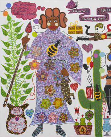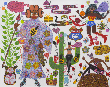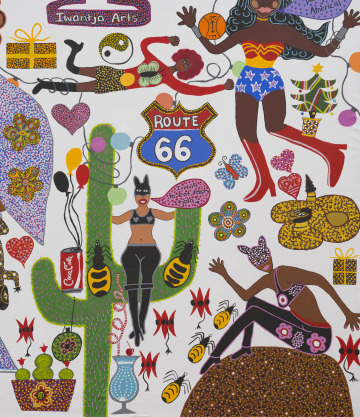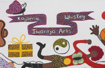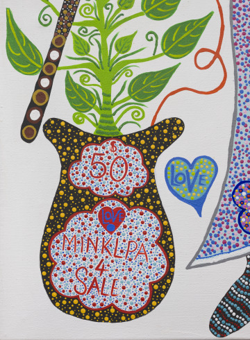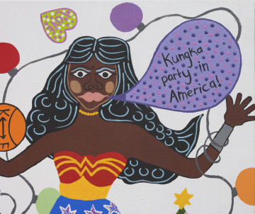 Kaylene Whiskey loves American music and movies. In this painting she imagines female celebrities visiting her remote desert community of Indulkana, South Australia. Painted in comic-strip style with speech and thought bubbles, the women, or kungkas, address the viewer. Here, a giant Princess Leia offers the nicotine-rich plant mingkulpa, while one version of Cat Woman declares her hunger for tjala, the Aboriginal delicacy honey ants. Wonder Woman announces a kungka party in America. Combining powerful women with Indigenous Australian cultures, Whiskey playfully celebrates sisterhood and invites everyone to have fun.