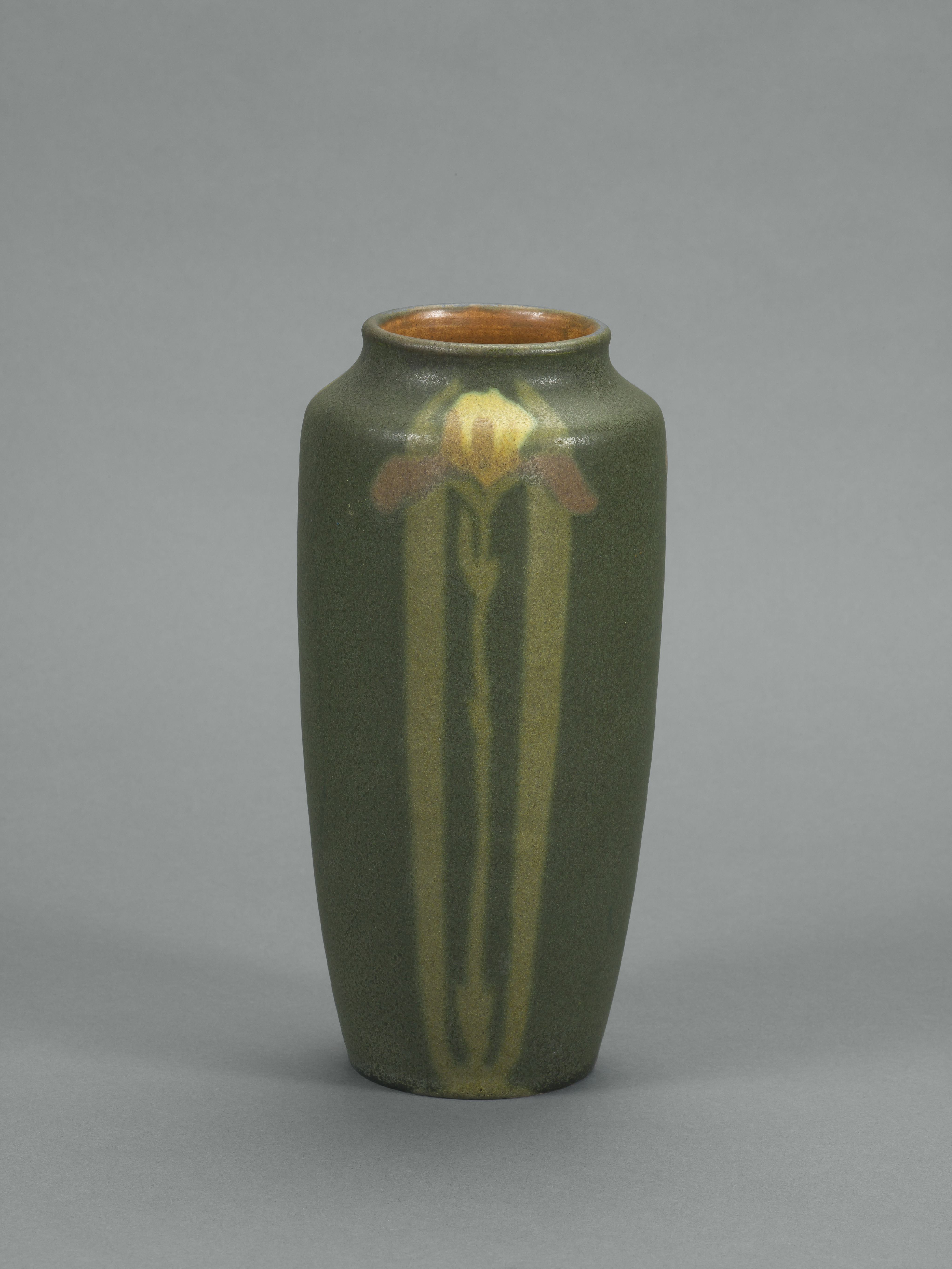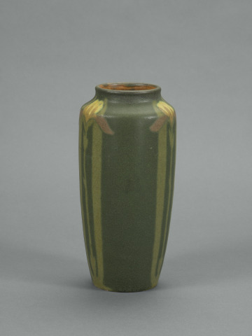 The matte-textured green glaze, limited tonal range, and conventionalized floral design on this vase epitomize the Arts and Crafts aesthetic of simplicity in form, color, and decoration. Frederick Walrath worked alone to form, decorate, and fire his own wares using the facilities of the Mechanics Institute in Rochester, New York, where he taught ceramics.