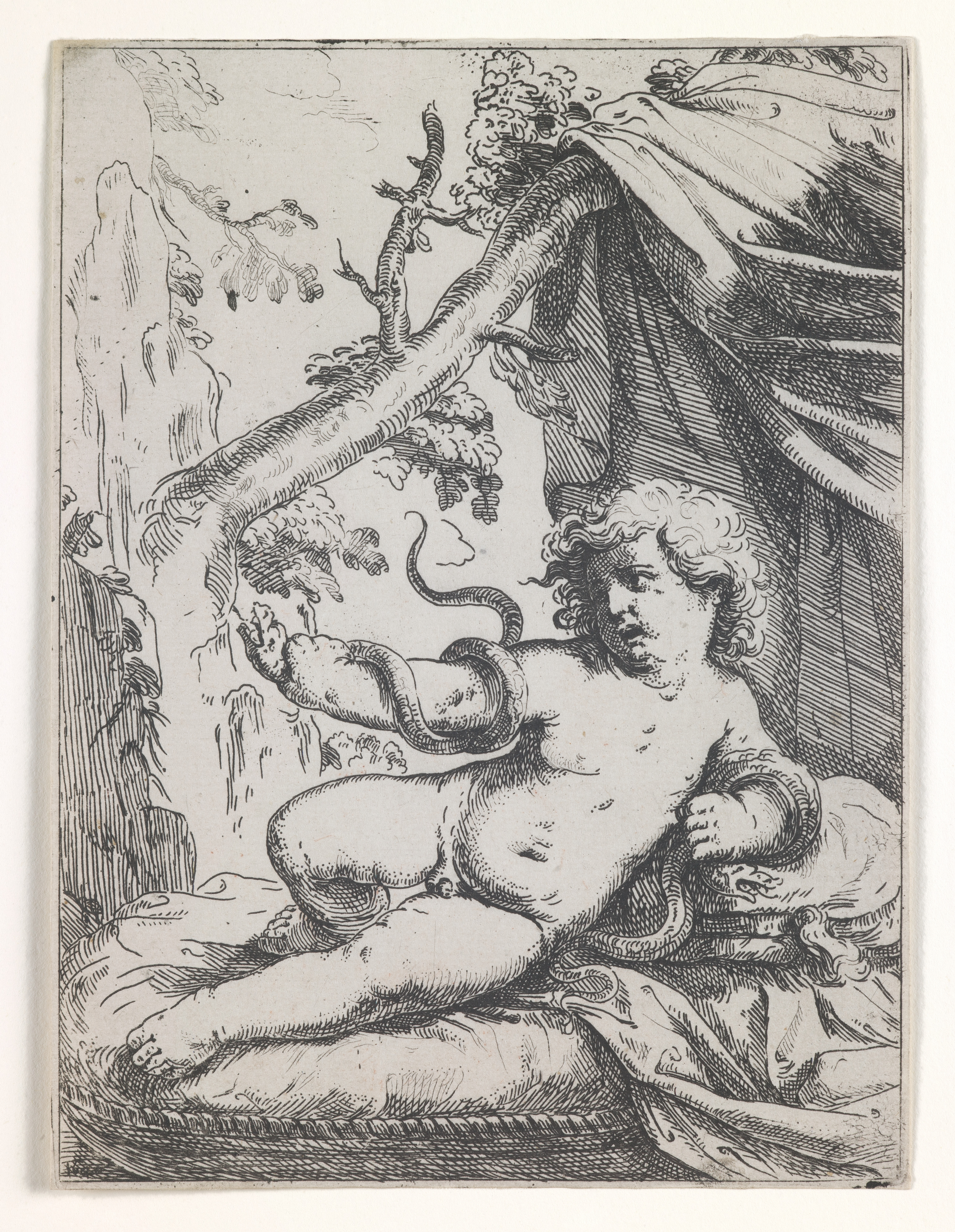 Hercules, a mortal son of the Roman god Jupiter, first demonstrated his powers in the episode illustrated here. Hercules effortlessly strangled two serpents sent by his jealous stepmother Juno to attack him in his cradle. Although his body is that of a dimpled infant, Hercules’s pose mimics that of classical heroes at rest (see the engraving of Meleager, also on view), an attitude often used to highlight the beauty of the perfected body.