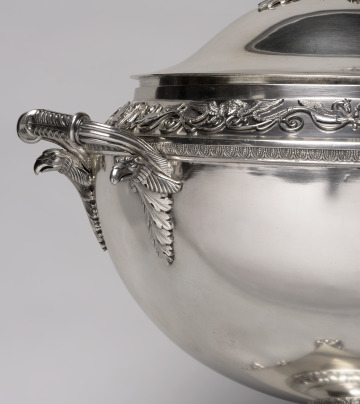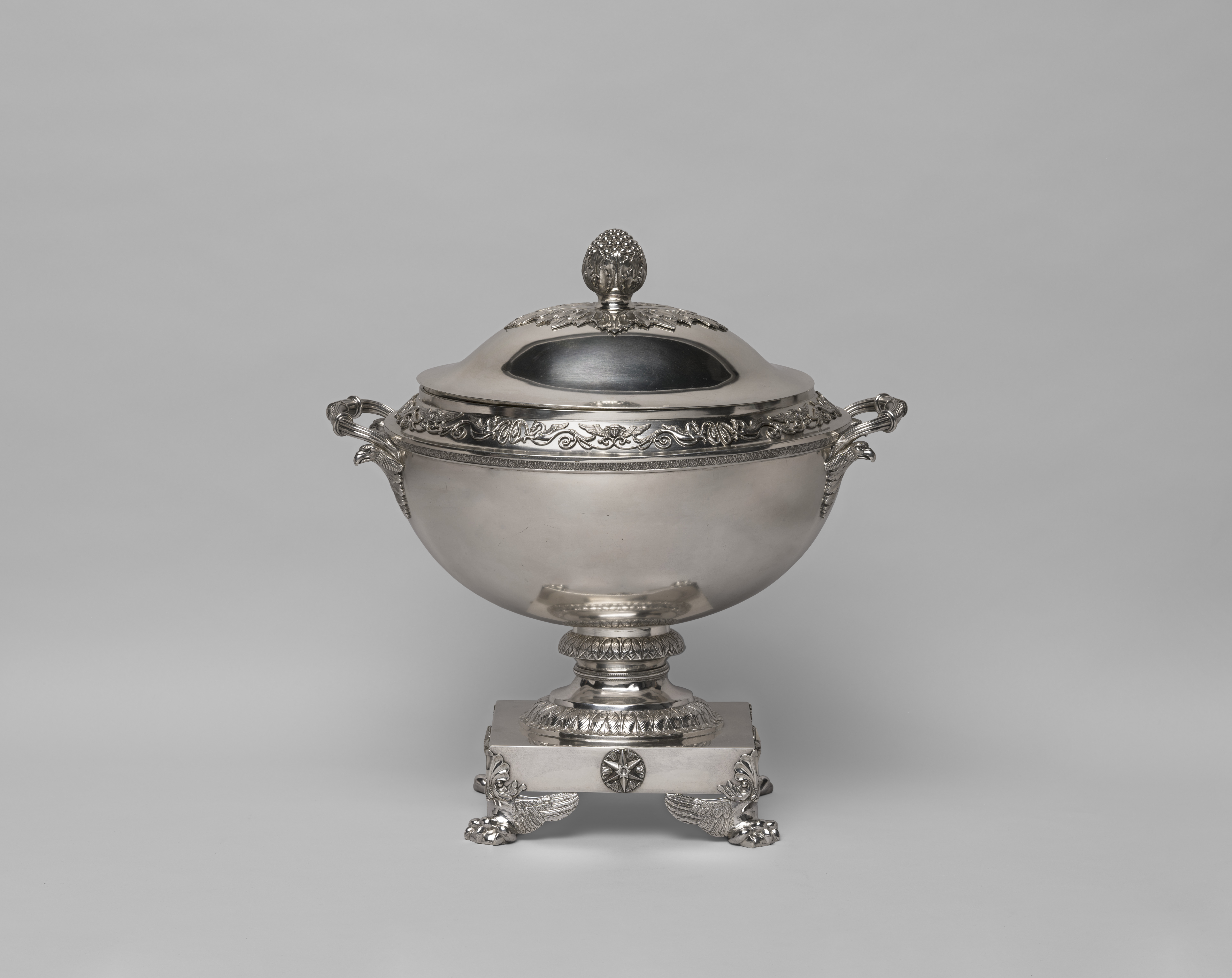 Thomas Fletcher and Sidney Gardiner designed this tureen for a dinner service that was presented to Commodore John Rodgers by the citizens of Baltimore to commemorate his defeat of the British at Fort McHenry in 1814. The design combines highly polished forms divided by bands of classical ornament. The tureen's voluminous round body and the square plinth on which it rests are polished to mirrorlike perfection. Atop the lid, a fruit finial erupts from a rosette of foliage. An appliqué of scrolls punctuated by winged masks and mythological beasts encircles the rim, while pairs of eagles' heads support the handles. Bands of textured foliage enrich the flared moldings of the stem, and winged lions' paws elevate the base. The combination of restrained geometric forms with rich ornament embodies a French style of silver design popular in the early nineteenth century.