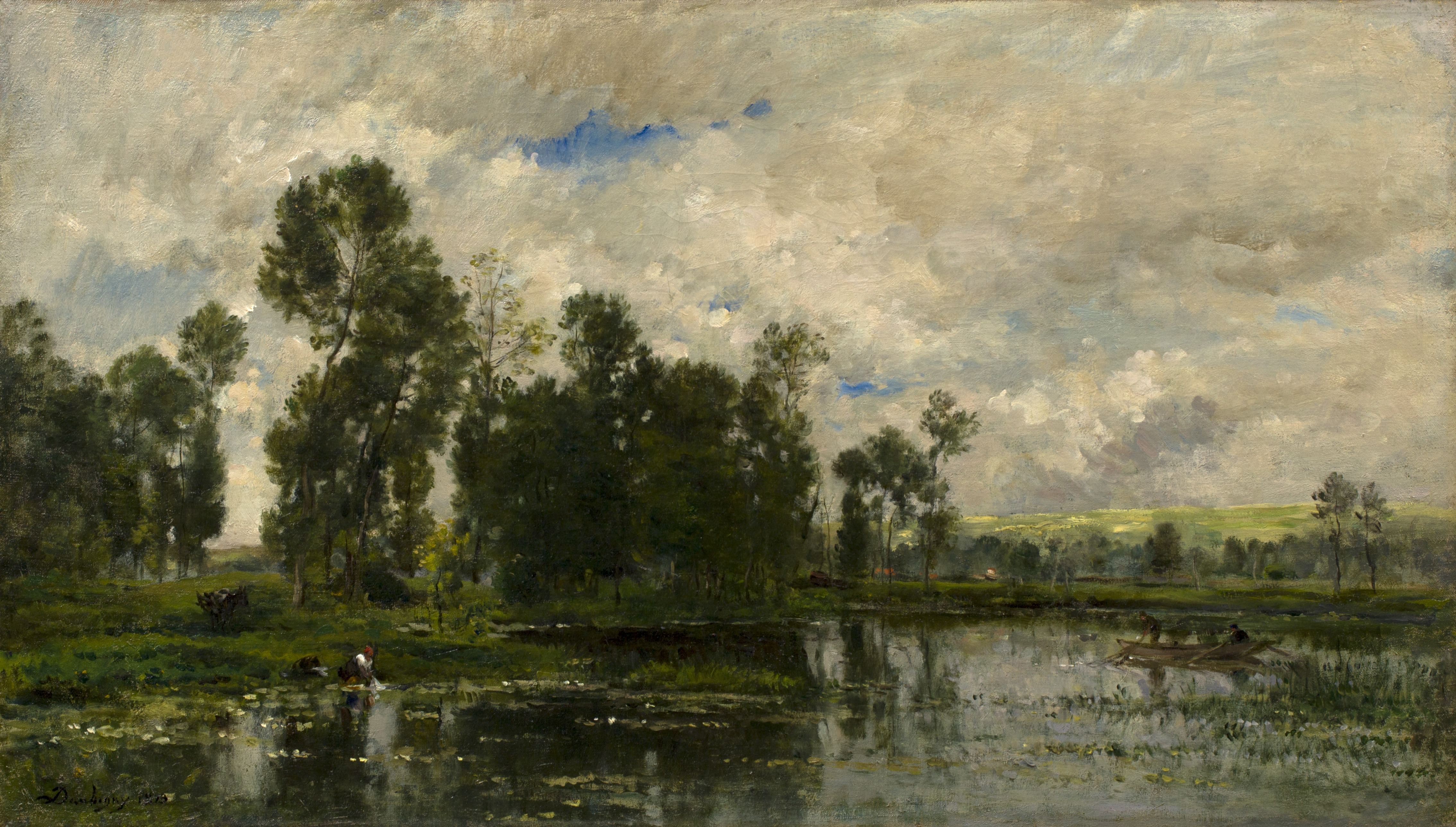 This painting is notable for its gestural brushwork and touches of color, as in the bright green hills in the distance. Like many of Charles-François Daubigny’s pictures, the scene is animated by the figure of a washerwoman. The artist’s paintings were often criticized for being “impressions” rather than fully realized works. Daubigny was an important early supporter of the Impressionists, and his own work suggests the influence of the younger artists.